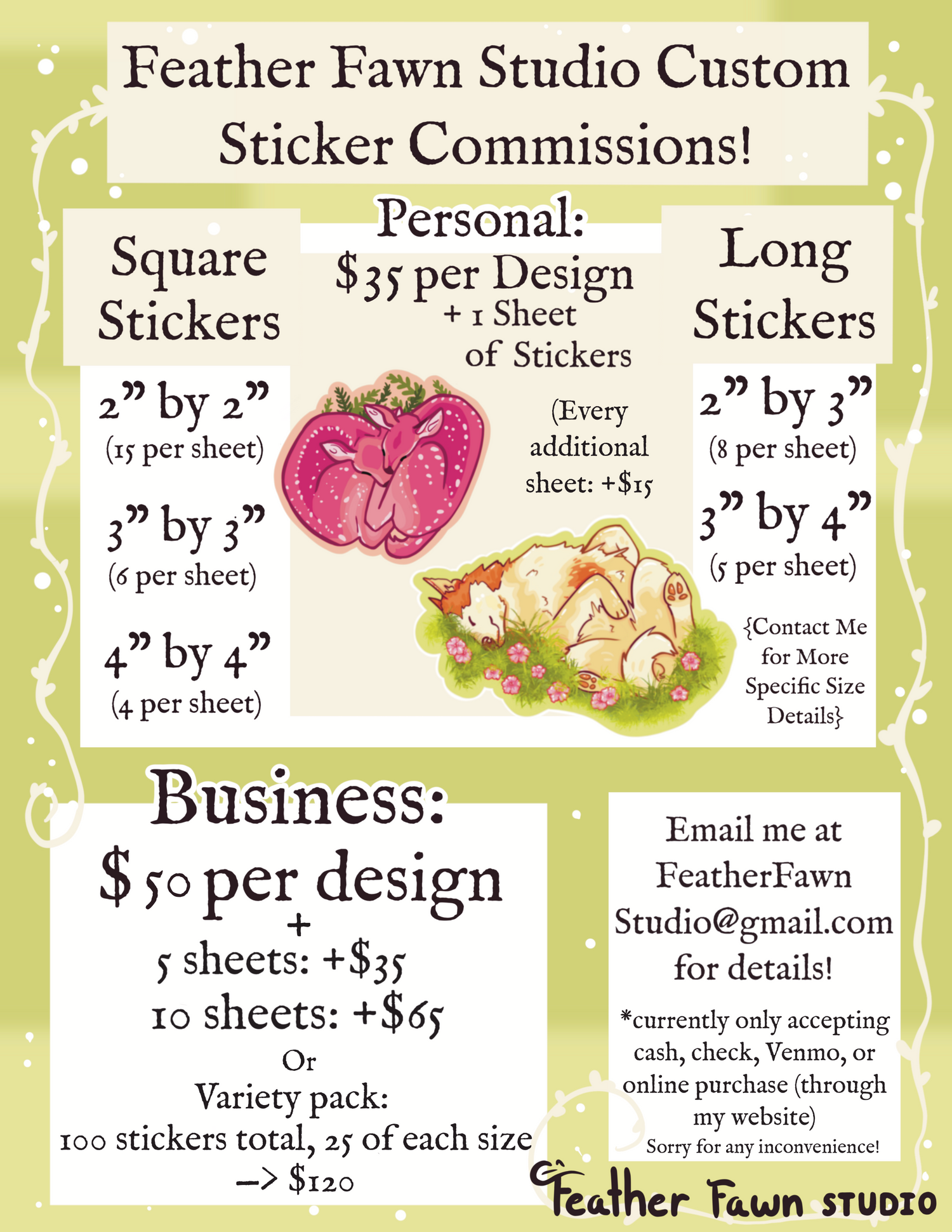 Commision details available in the image, my socials, or via E-mailing me! Contact me at FeatherFawnStudio@gmail.com for more information!!!